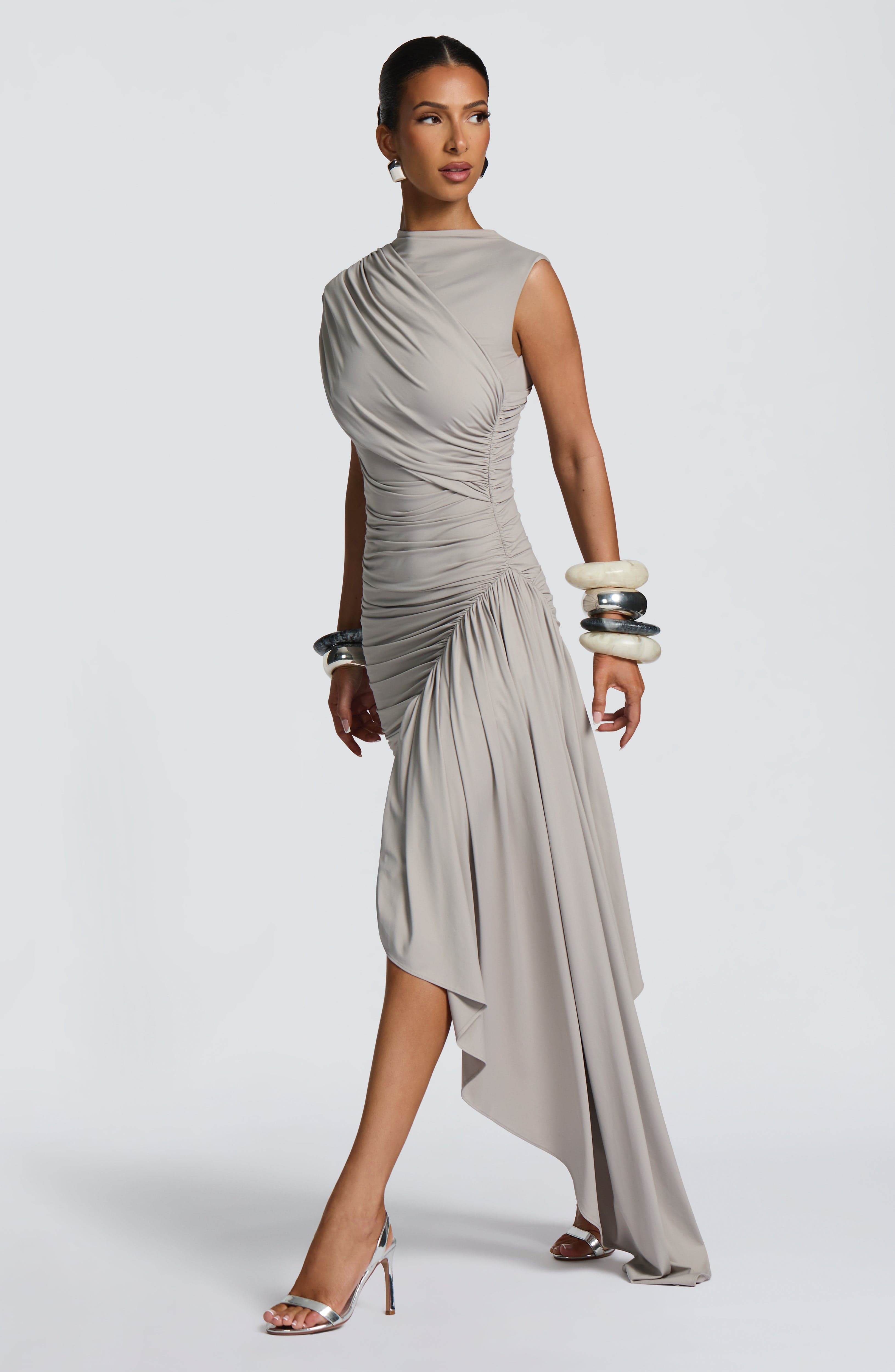 The Marnie Mini Dress in light grey features a sleek high neckline and a delicate button and elastic loop closure with a keyhole detail. Fully lined with multiple directional pleats, ruching on the bodice, and a shaped gathered drape panel, it exudes refined elegance. The overlay cowled back completes this sophisticated silhouette.