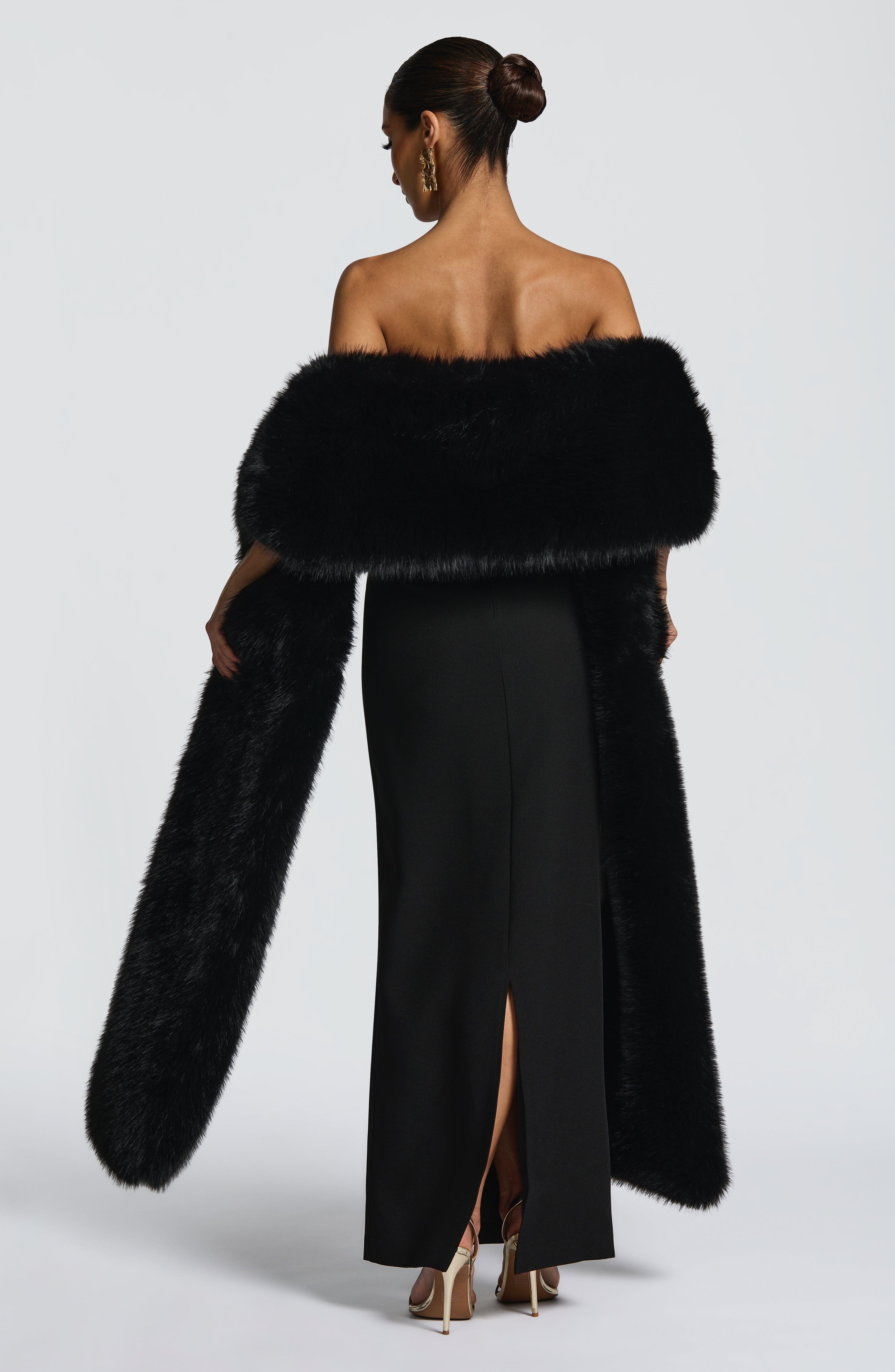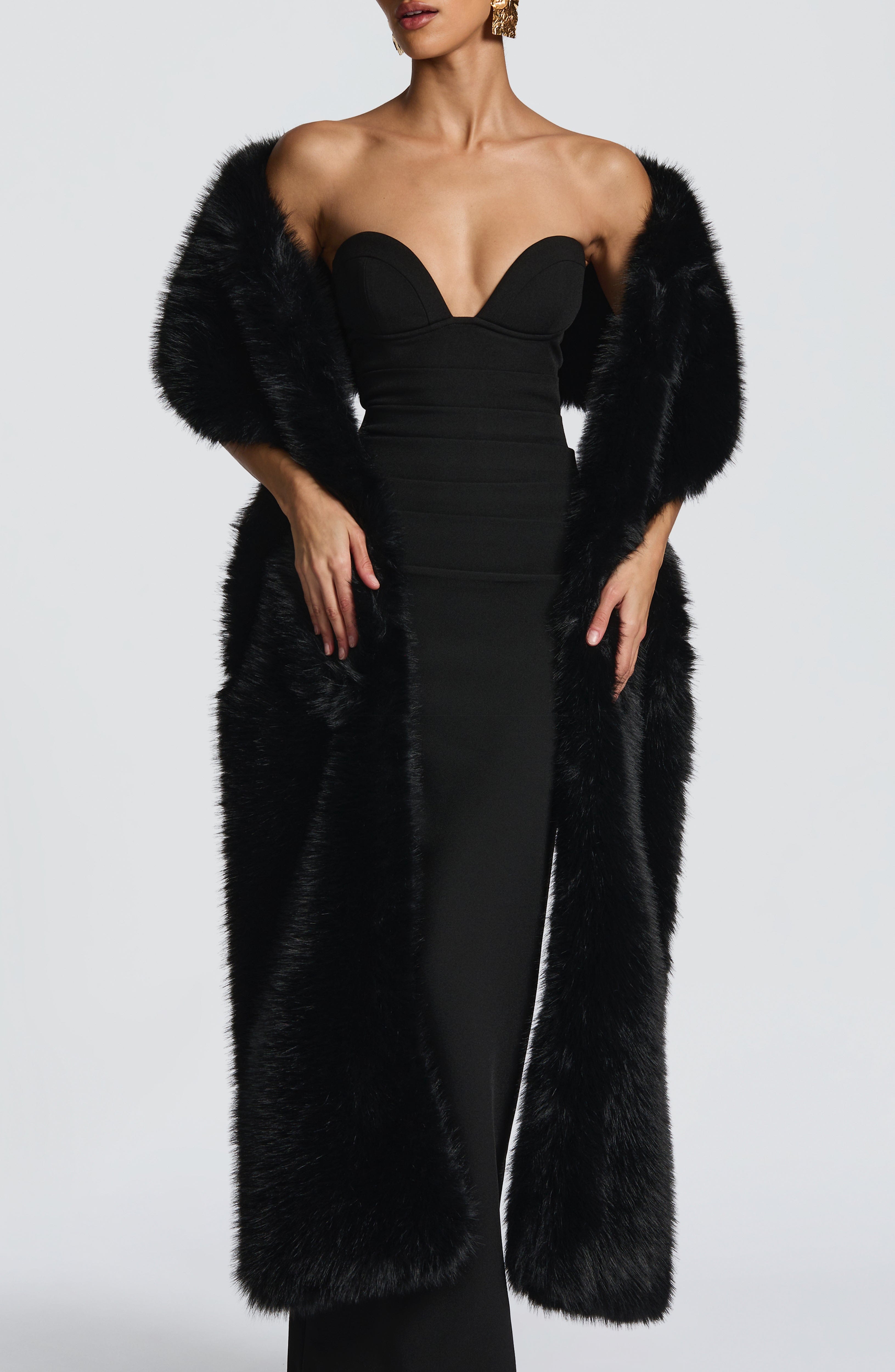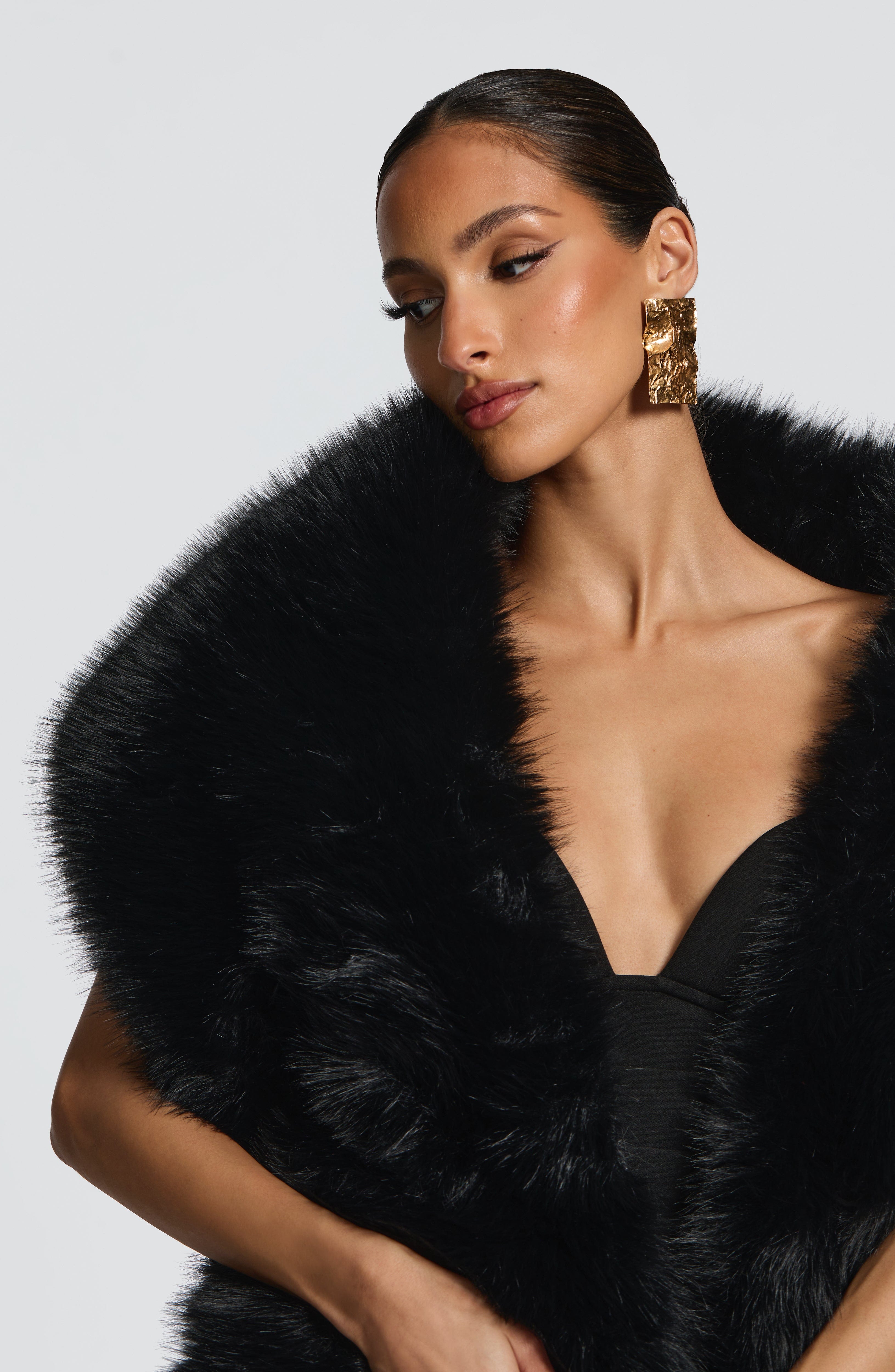 Elevate your ensemble with the Lulu Shawl in Black, crafted from luxurious, plush faux fur. This elegant accessory adds a bold, sophisticated touch when draped over your favourite outfit, blending timeless style with modern flair.