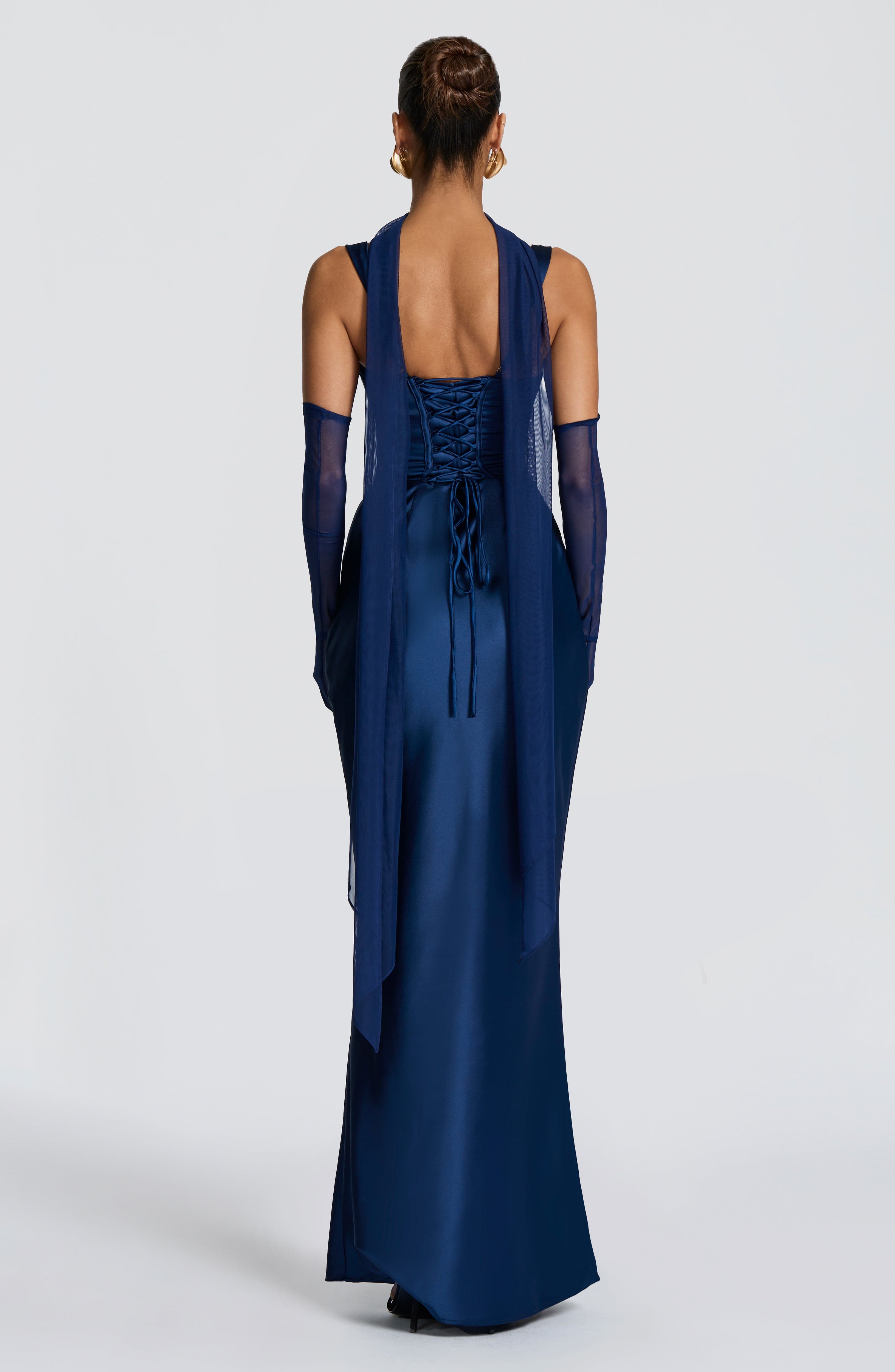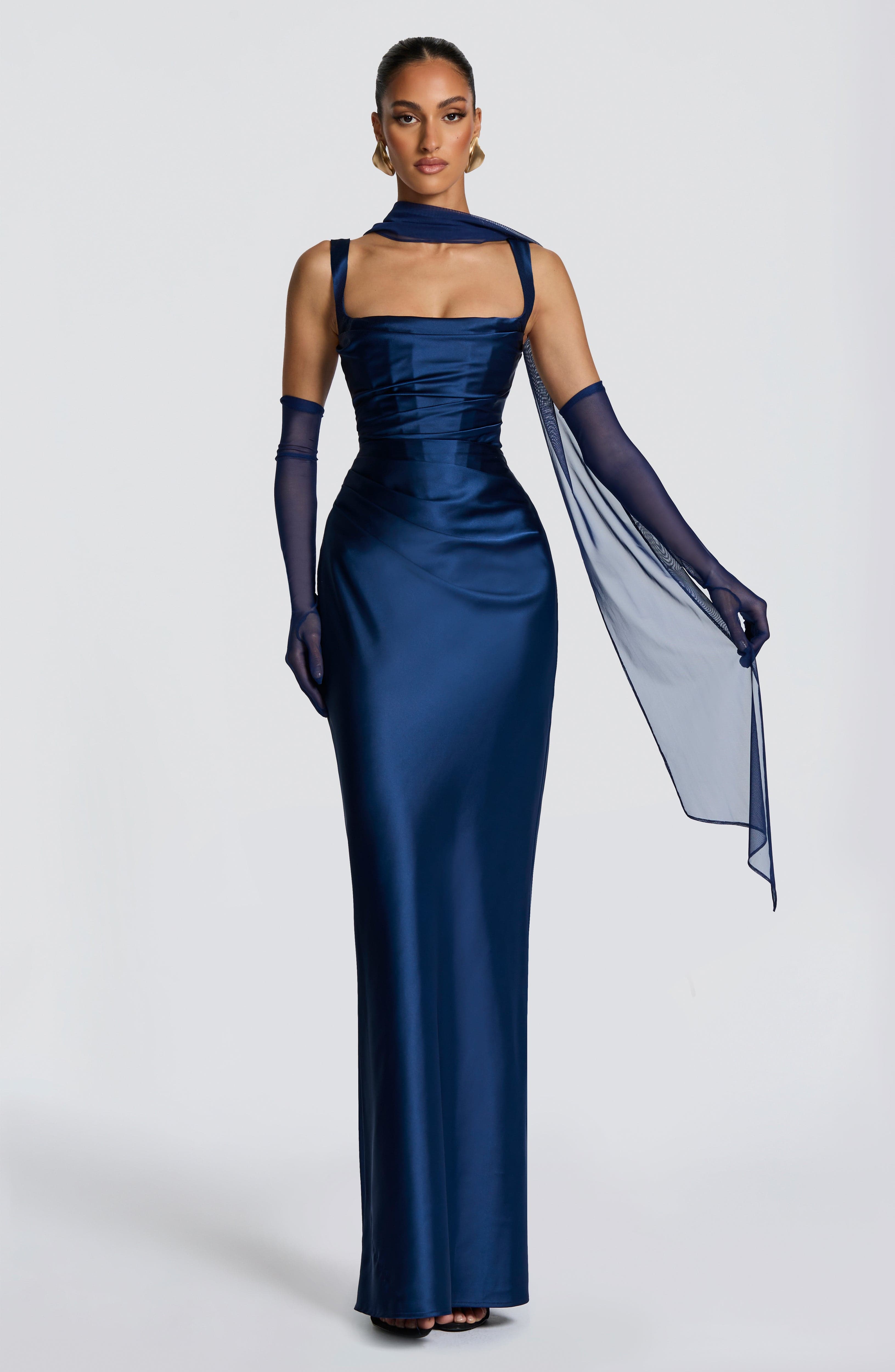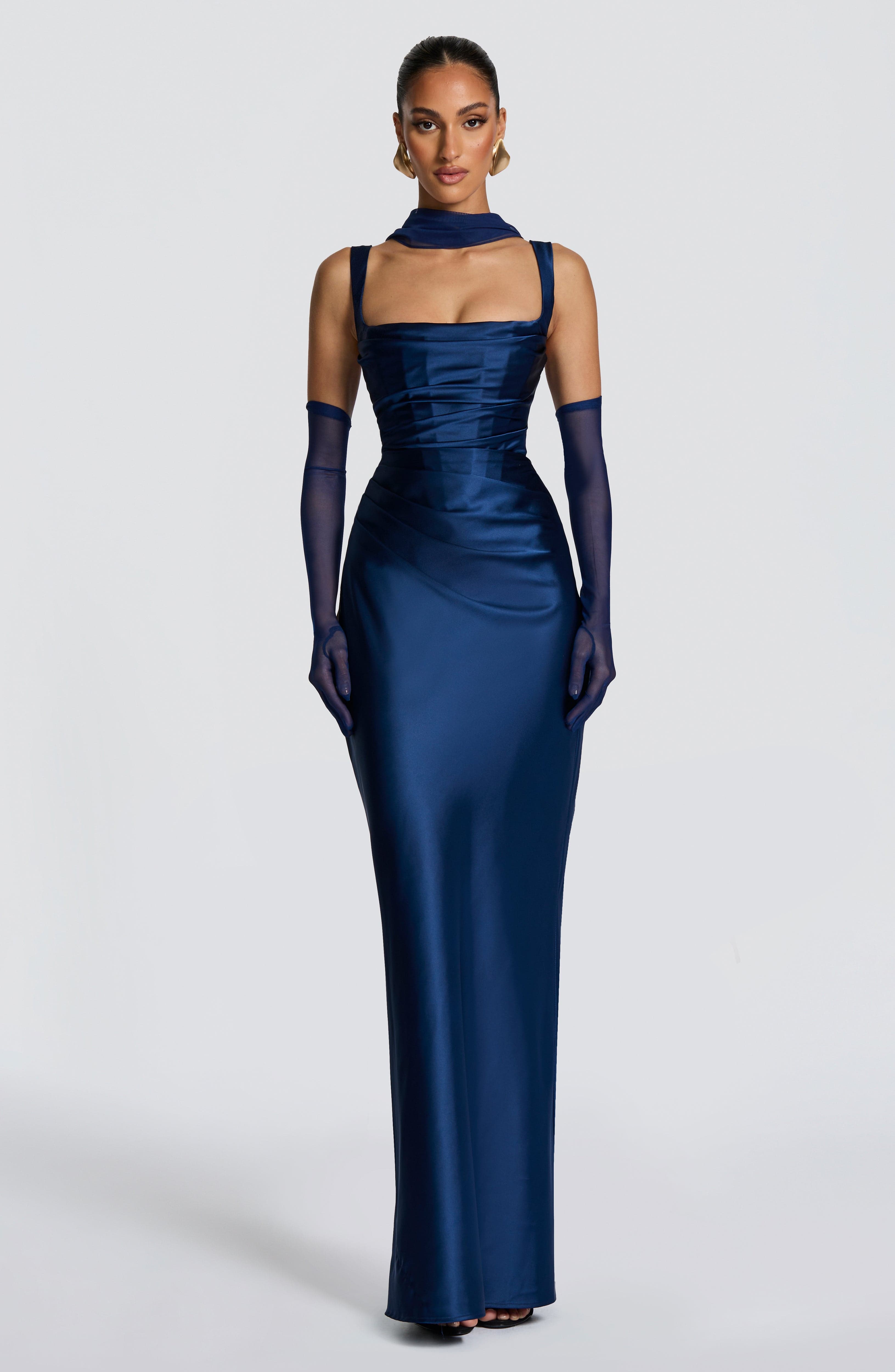 The Ayla Scarf in navy features a light stretch mesh fabric that drapes elegantly around the neck, adding a refined touch to any ensemble.