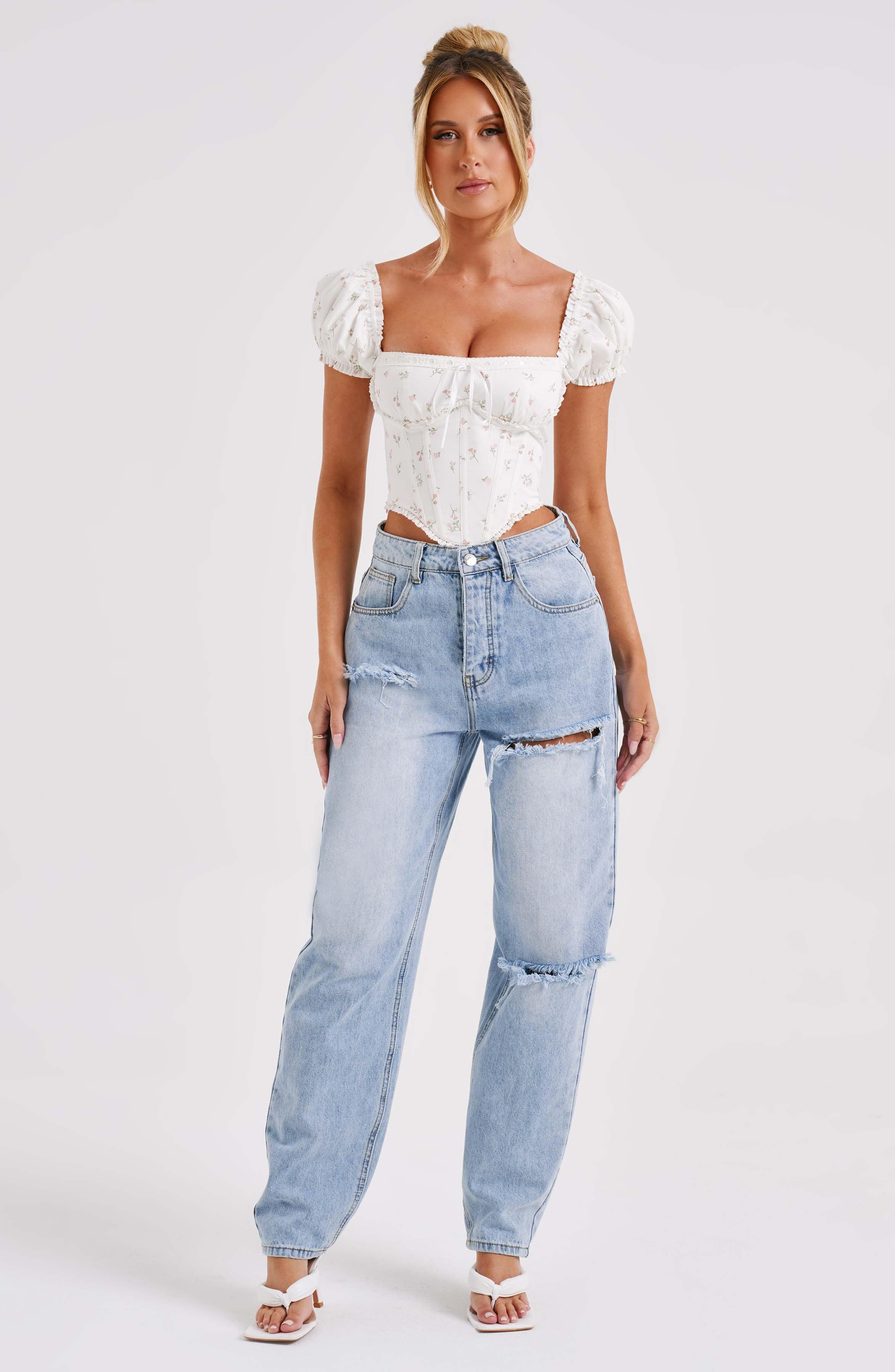 Must-have milkmaid corsets are what we're wearing ALL season with our fave denim and mule heels. Matilda has dreamy puffed sleeves with a snatched waist and pretty tie detail to the bust.