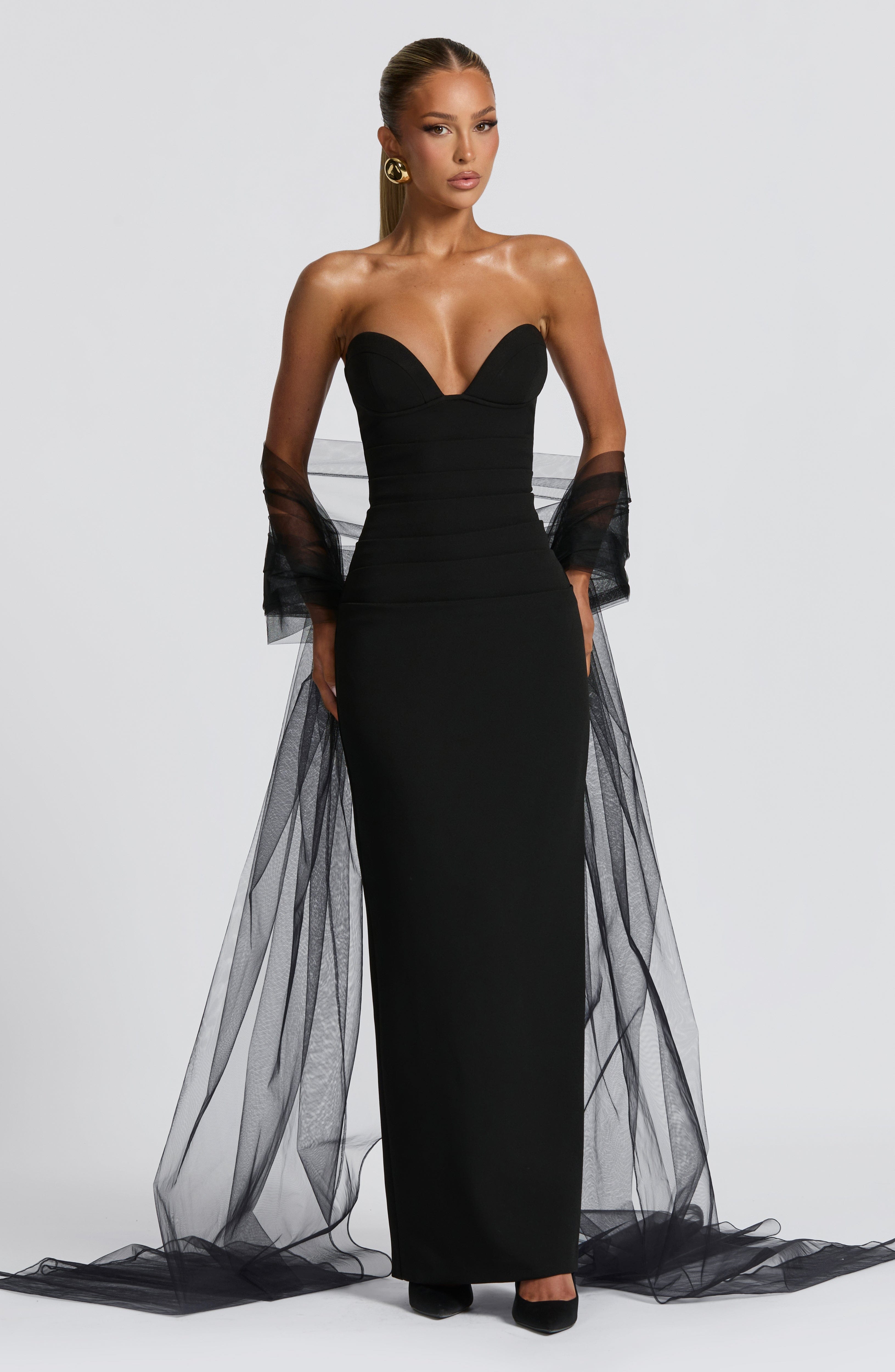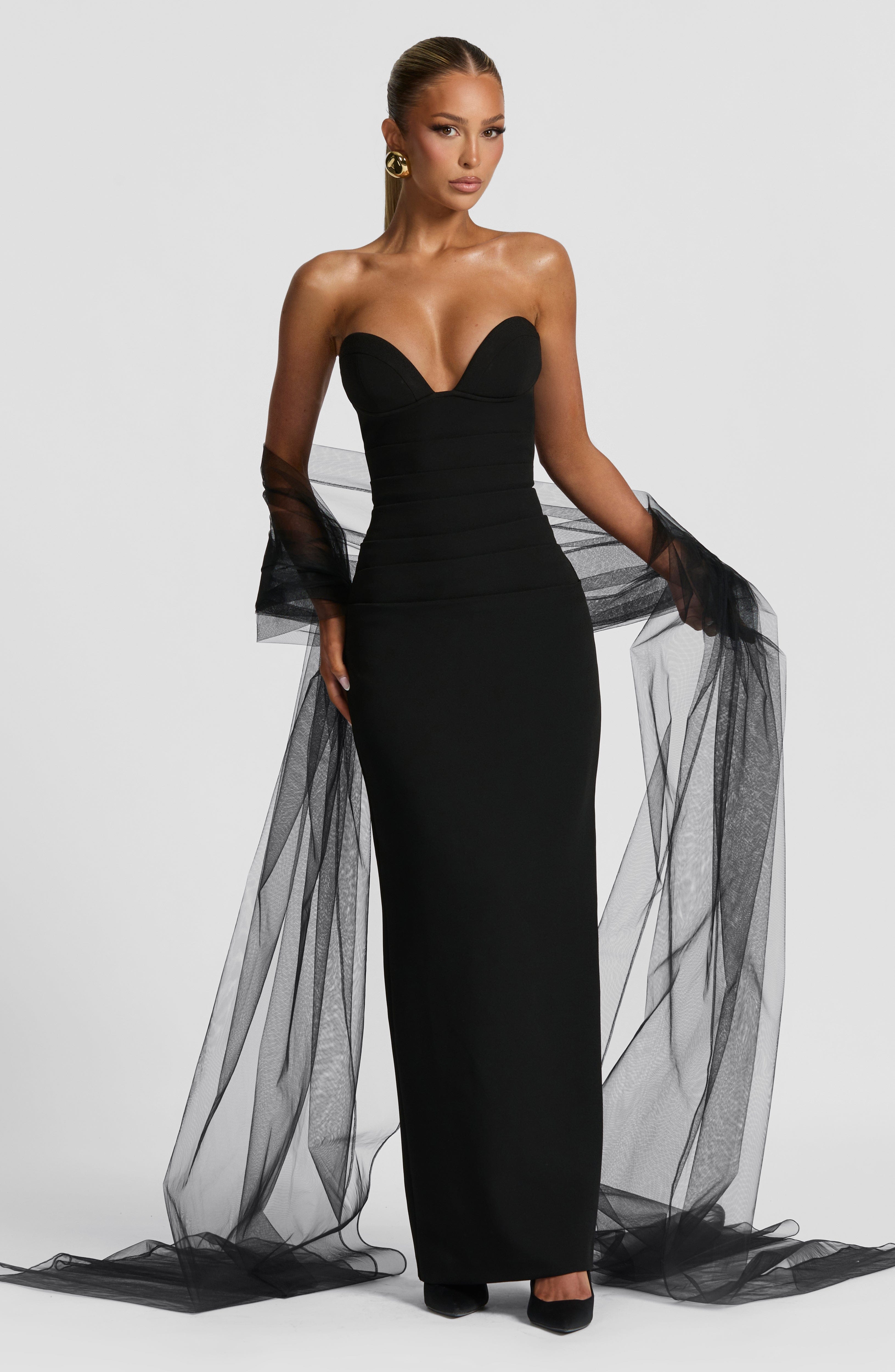 Elevate your ensemble with the Myrtle Shawl in black. Crafted from sheer, lightweight tulle, this extra-long shawl offers a graceful drape with moderate width, adding volume and elegance. Perfect to wear delicately over the arms or softly around the neck.
